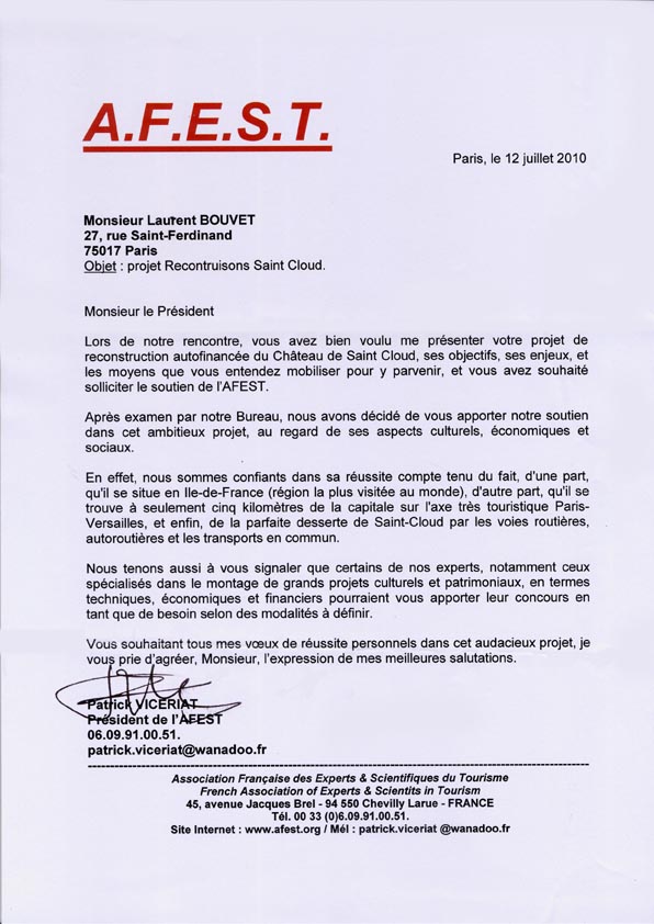 COMITÉ RÉGIONAL DU TOURISME D'ILE-DE-FRANCE ASSOCIATION FRANÇAISE DES EXPERTS ET SCIENTIFIQUES DU TOURISME ACO and Co (Consultant et expert international en économie du tourisme et de la culture) VIEILLES MAISONS FRANCAISES DE FRANCE ET DE NAVARRE EURO - CARAÏBES AMITIÉS INTERNATIONALES ANDRÉ MALRAUX FRENCH HERITAGE SOCIETY ÉCOLE D'ART MURAL DE VERSAILLES SOCIÉTÉ D'ENCOURAGEMENT AUX MÉTIERS D'ART COMPAGNONS DU TOUR DE FRANCE DES DEVOIRS UNIS FÉDÉRATION DES CRISTALLERIES ET VERRERIES VENDÉE EXPANSION (S.E.M. en charge du développement économique de ce département où se trouve le Puy du Fou) BOULOGNE-ENVIRONNEMENT (Association de défense de l'environnement) INSTITUT DE LA MAISON DE BOURBON ASSOCIATION MARIE-ANTOINETTE SOUVENIR NAPOLÉONIEN ACADÉMIE NAPOLÉON ASSOCIATION POUR LA CONSERVATION DES MONUMENTS NAPOLÉONIENS AMIS DU PATRIMOINE NAPOLÉONIEN ASSOCIATION BELGE NAPOLÉONIENNE INSTITUT NAPOLÉONIEN MEXIQUE-FRANCE INSTITUT ÉMIR ABDELKADER (Présidé par M. Bernard Stasi, ancien ministre)