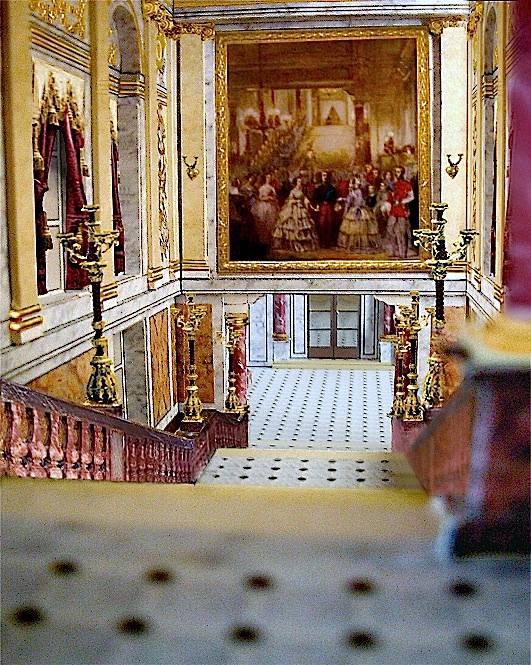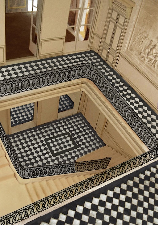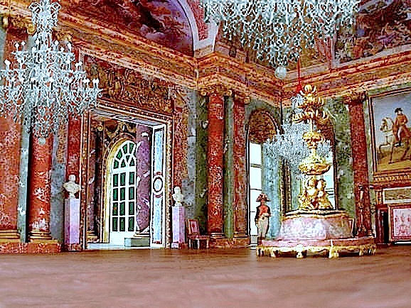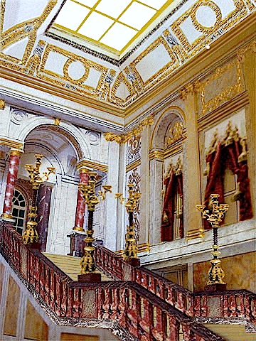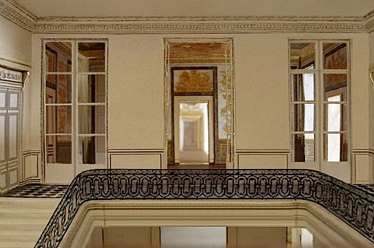 Salon de l'Aurore mit den drei großen Glastüren und das darüber erreichbare, von Marie-Antoinette beauftragte Treppenhaus.