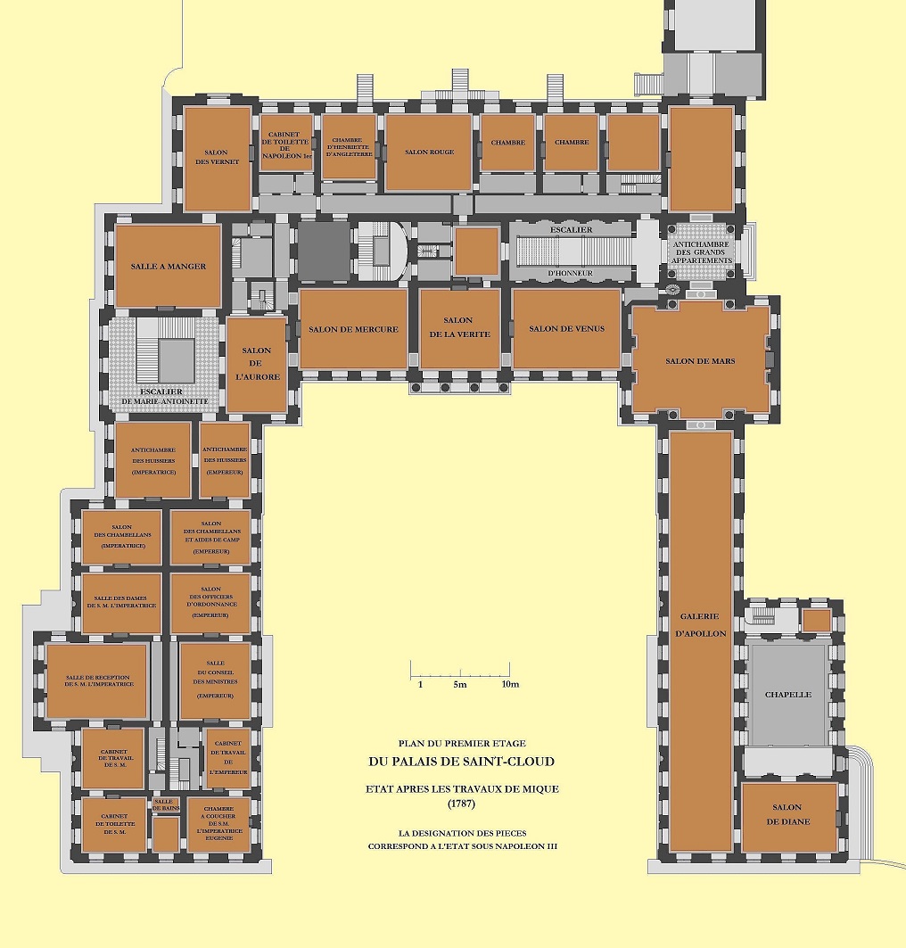 Plan des ersten Stockwerks nach den Plänen von Richard Mique aus dem Jahr 1787. Die Namen der Salons entsprechen der Benennung unter Napoléon III.
