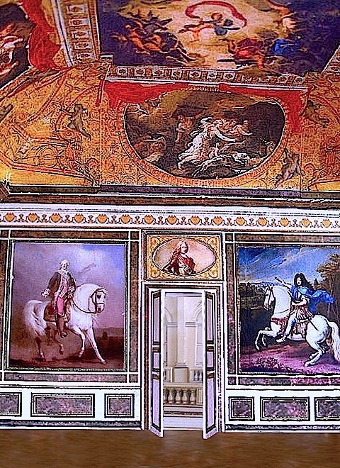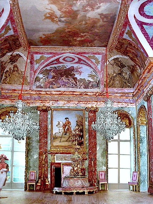 Im ersten Stock des rechten Gebäudeflügels befanden sich hofseitig die Galerie d'Apollon, parallel dazu an der Außenseite die Schlosskapelle und davor, kopfseitig gelegen, der Salon de Diane. Auf dem Rückweg zum zentralen Teil des Schlosses passierten Besucher wieder den Salon de Mars und erreichten darüber die vier im mittleren Gebäudeflügel gelegenen Salons.