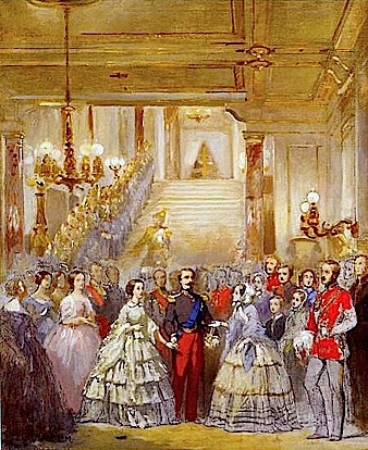 Napoléon III. empfängt Queen Victoria bei ihrem Besuch der Weltausstellung von 1855 am Fuße der Ehrentreppe von Saint-Cloud. (Detail und urspr. Platzierung des Gemäldes)